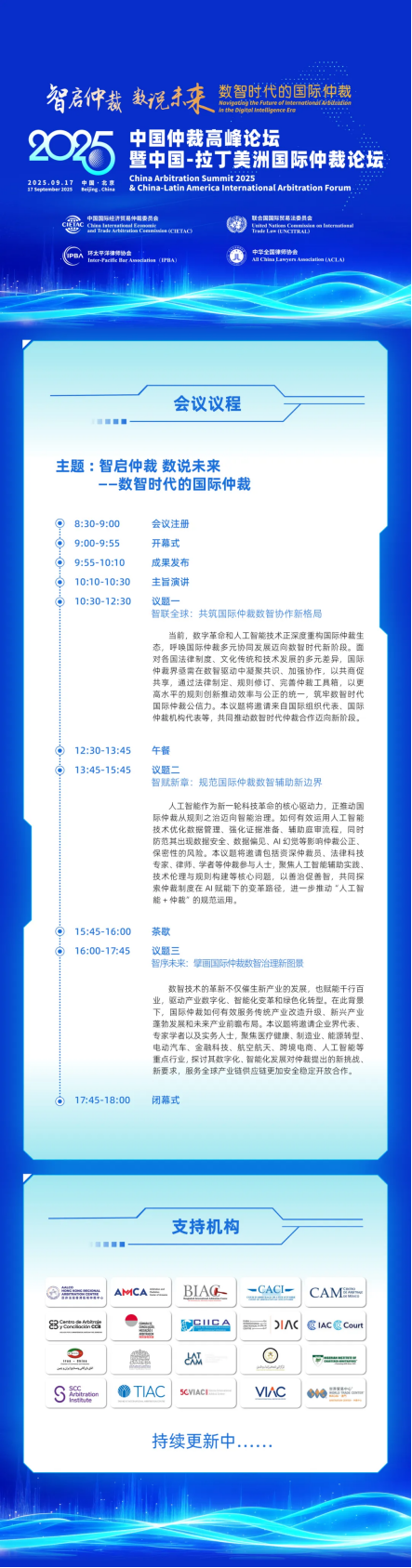 由中國國際經(jīng)濟貿(mào)易仲裁委員會(CIETAC)、聯(lián)合國國際貿(mào)易法委員會(UNCITRAL)、環(huán)太平洋律師協(xié)會(IPBA)以及中華全國律師協(xié)會(ACLA)聯(lián)合舉辦的2025中國仲裁高峰論壇暨中國-拉丁美洲國際仲裁論壇將于2025年9月17日在北京舉辦。