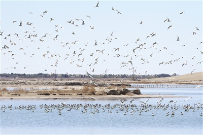 三五成群的遺鷗、赤麻鴨、黑翅長腳鷸時而用翅膀拍打水面展翅飛翔,時而在水中嬉戲、覓食,一幅鳥集鱗萃的景象。