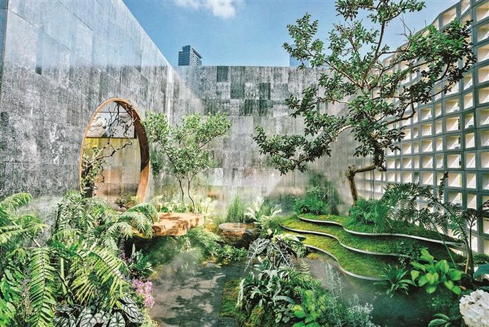 據(jù)介紹,“方寸之間”陽(yáng)臺(tái)花園透過(guò)兼具閱讀室與茶室的半室內(nèi)空間的框景視窗,使視線延伸至遠(yuǎn)方;樹干的堅(jiān)韌與苔蘚的柔軟相互交融,繪成一幅生機(jī)勃勃的園景。陽(yáng)臺(tái)花園中使用的電鍍石材、科技空心磚、與太陽(yáng)能燈、回收瓦 片、卵石路結(jié)合,數(shù)字龍華印象與禪意空間的景觀形成強(qiáng)烈的對(duì)比,禪意與科技、當(dāng)下與未來(lái)合二為一,在方寸之間獲得無(wú)限可能。