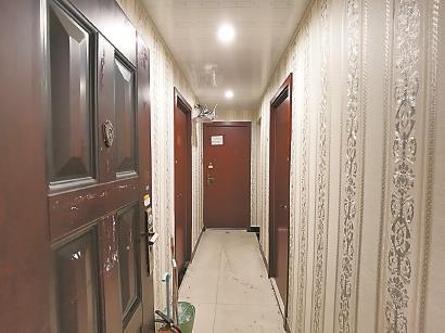 效果如何?記者對(duì)103號(hào)、104號(hào)兩幢小高層進(jìn)行了“掃樓”,這兩幢樓最近多次被投訴。幾個(gè)樓層一跑,群租房的一些外觀特點(diǎn)不難辨別:房門大多還是交房時(shí)的原鐵門,一些只是將門鎖換成了密碼鎖,門上貼滿“開鎖”“搬家”小廣告無(wú)人清理……103號(hào)樓402室的鐵門半掩,看進(jìn)去只能看到一條直角過(guò)道,兩側(cè)排布5個(gè)房間,均房門緊鎖,1個(gè)門上還貼著寫有“已租、勿擾”的紙條。過(guò)道里裝有感應(yīng)燈,上方架有路由器,地上擺著垃圾桶和滅火器,此外別無(wú)他物。整套房子的原結(jié)構(gòu)已一點(diǎn)看不出來(lái),過(guò)道入口處墻壁上高處嵌著一只燃?xì)恻S色開關(guān)閥門,大概可以猜測(cè)出這里曾是廚房的位置;104號(hào)樓401室也是房門開著,里面結(jié)構(gòu)與上述402室相似,只是房間有6個(gè)。其中1個(gè)房間門上插著鑰匙,擰開一看里面應(yīng)是原衛(wèi)生間的一部分,如今已被改造成了洗衣房。