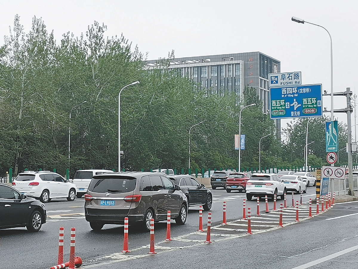 5月27日14時,記者來到楊莊東橋東側(cè)阜石路入口。此時雖是周末的平峰時期,但入口處兩條車道上一直滿滿地排著車輛。在20分鐘的觀察時間里,記者發(fā)現(xiàn),大約有一多半的司機遵守了規(guī)定。有左側(cè)車道內(nèi)的司機在前車駛?cè)牒?,發(fā)現(xiàn)右側(cè)車道上的車輛還在后方,會主動踩下剎車,等候右側(cè)車輛先行駛?cè)耄灰灿猩碓谟覀?cè)車道的司機,在左側(cè)車道車輛駛過,發(fā)現(xiàn)其后的車輛還要跟著駛?cè)?,于是打開車窗作出“按壓”的停止手勢,要求旁邊車輛等待,以便交替通行。