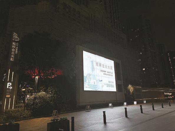 晚上8時(shí)半,記者在現(xiàn)場看到,張先生反映的這塊廣告屏位于旭輝企業(yè)大廈停車場入口處,靠近長壽路常德路路口,位置醒目。整個(gè)廣告屏高度達(dá)到十多米,屏幕面積很大,上面播放的內(nèi)容是辦公樓的租賃廣告,使用的是LED光源,亮度非常高。廣告內(nèi)容會(huì)循環(huán)播放,尤其是每播放完一遍屏幕就會(huì)出現(xiàn)一次“白屏”現(xiàn)象——整塊屏幕發(fā)出強(qiáng)烈白光,持續(xù)十多秒,眼睛無法直視,走在廣告屏的白光下連手機(jī)屏幕都看不清。