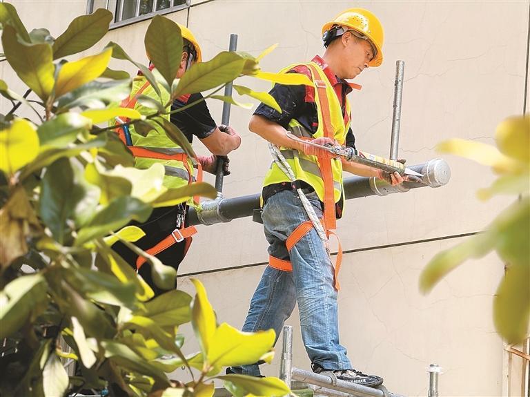 為盡可能減少施工對居民生活的影響,改造采用“微創(chuàng)手術(shù)式”作業(yè)。施工現(xiàn)場,一組工作人員正在備料場內(nèi)按尺寸切割管道,另一組工作人員已在腳手架上安裝新管道。