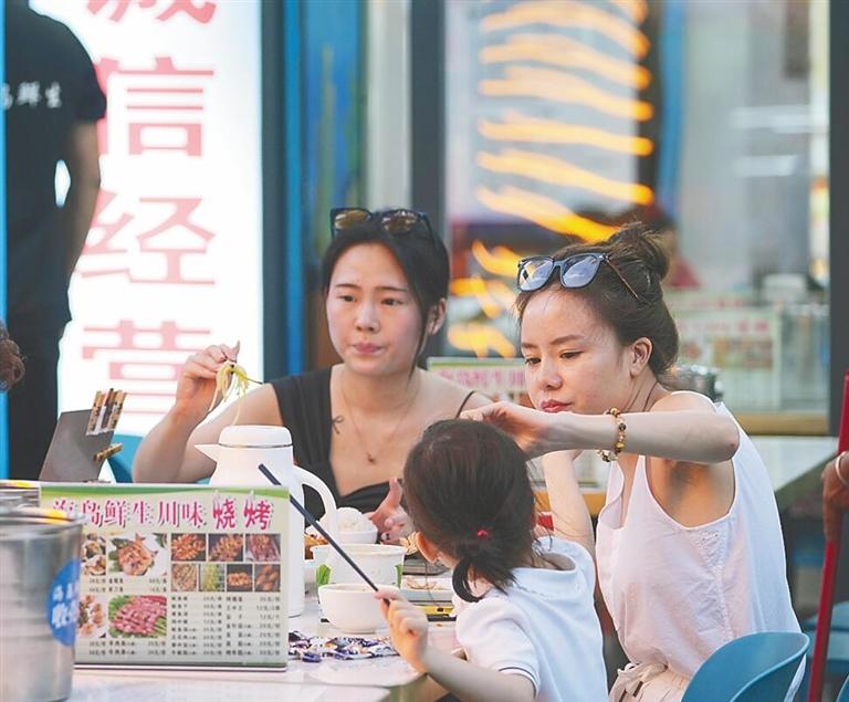 外國游客在新民街海島鮮生海鮮加工店的外擺攤位就餐。圖片均由記者王程龍攝