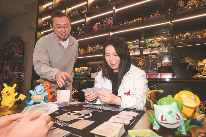 6月11日,南京市西城夜未央一家潮玩店,店主在指導(dǎo)客人玩卡牌游戲。小店定期組織卡牌對(duì)戰(zhàn)活動(dòng),將興趣與消費(fèi)深度融合,吸引不少消費(fèi)者光顧。記者 陳儼 攝