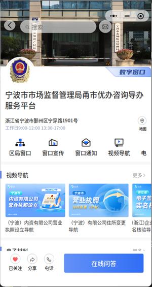 目前,“甬市優(yōu)辦”共有區(qū)局窗口、窗口宣傳、窗口通知、視頻導(dǎo)航、電子材料、政策法規(guī)六個(gè)板塊。其中三個(gè)核心板塊——窗口宣傳板塊可查詢寧波各地市場(chǎng)監(jiān)管行政審批窗口地址及對(duì)應(yīng)咨詢電話,視頻導(dǎo)航板塊可了解窗口高頻業(yè)務(wù)辦理流程,電子材料板塊可搜索各類型業(yè)務(wù)所需材料清單及參考模板。