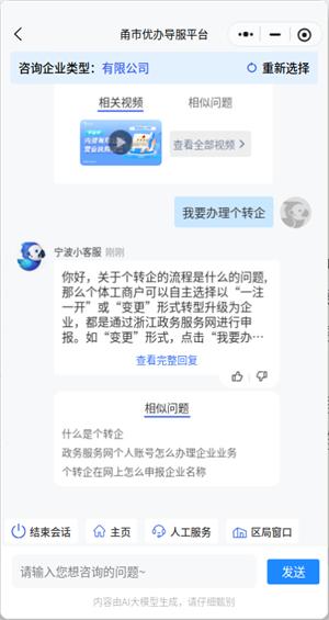 針對(duì)經(jīng)營(yíng)主體個(gè)性化需求,“甬市優(yōu)辦”設(shè)置在線問(wèn)答功能,能夠智能答復(fù)涵蓋開(kāi)業(yè)登記、變更登記、注銷登記、檔案查詢等各類場(chǎng)景的上百項(xiàng)高頻問(wèn)題。對(duì)于高頻問(wèn)題未能覆蓋的其他問(wèn)題,經(jīng)營(yíng)主體也可以通過(guò)轉(zhuǎn)人工的方式,向后臺(tái)工作人員咨詢。