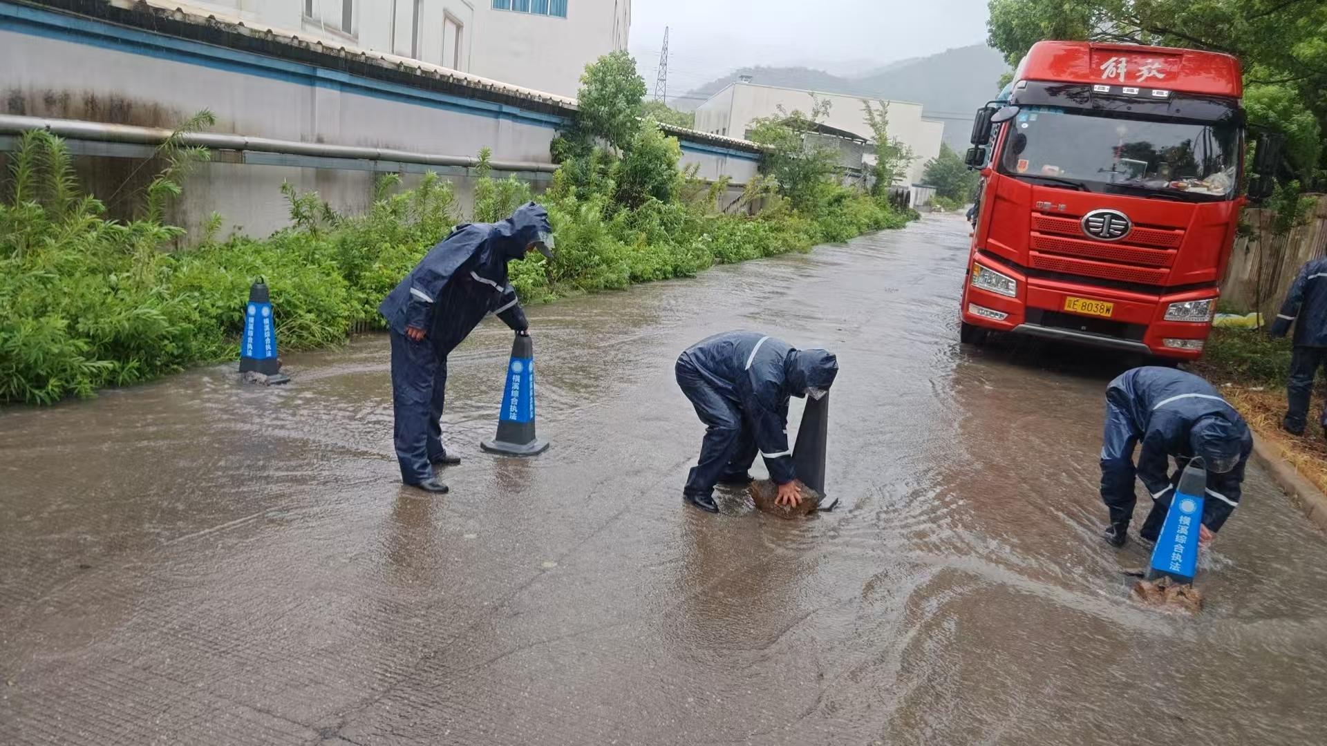 象山縣大徐執(zhí)法中隊(duì)則面臨另一場考驗(yàn)。受強(qiáng)降雨影響,軍民塘水位暴漲需緊急開閘泄洪。然而,部分村民為捕撈被沖出的魚群,不顧危險靠近湍急水域。大徐執(zhí)法隊(duì)迅速啟動應(yīng)急預(yù)案,聯(lián)合屬地力量,設(shè)置警戒線、開啟高音喇叭循環(huán)警示、進(jìn)行不間斷巡查,及時勸離圍觀撈魚群眾50余人次,有效防止了溺水、滑倒等安全事故,并向村民普及臺風(fēng)天安全知識。奉化溪口鎮(zhèn)執(zhí)法隊(duì)組建的市政排水應(yīng)急突擊隊(duì)成為風(fēng)雨中的“清道夫”。隊(duì)員們無畏艱險,逆風(fēng)而上,冒雨處置巡查中發(fā)現(xiàn)的倒伏樹木、斷枝、散落廣告布等路面障礙物,在積水嚴(yán)重的路段,他們設(shè)置警示標(biāo)志,協(xié)助排水部門緊急疏浚管道,清理堵塞的雨水箅子,爭分奪秒加快排水速度。