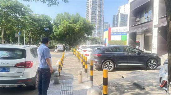 投訴信息傳來時(shí)已近傍晚,執(zhí)法中隊(duì)隊(duì)員顧不上休息,第一時(shí)間趕赴現(xiàn)場。在酒店門口,隊(duì)員們看到人行道邊緣的隔離樁明顯向外突出,原本供行人通行的區(qū)域被壓縮,路段被車輛堵住去路,確如市民所說存在繞行情況?!爱?dāng)時(shí)就覺得,哪怕只是幾厘米的侵占,也會(huì)影響行人安全,必須盡快處理。”執(zhí)法人員說道。