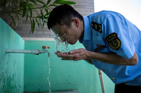 撤回休息點(diǎn),張可贊接起一抔水,潑到臉上,帶來一陣冰涼。回到室內(nèi),冷氣吹過身體,濕透的制服變得硬挺,張可贊和隊(duì)友拿起一瓶水,一飲而盡。