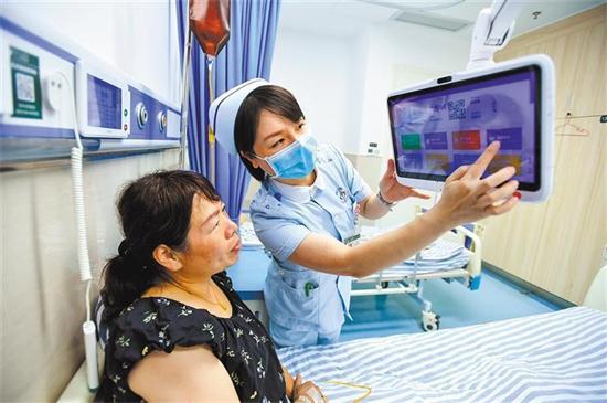 7月22日,江西省宜春市人民醫(yī)院護(hù)士在智慧病房向患者講解床頭交互系統(tǒng)的使用方法。當(dāng)?shù)卮罅ν七M(jìn)智慧醫(yī)院建設(shè),搭建互聯(lián)網(wǎng)醫(yī)院、遠(yuǎn)程醫(yī)療、智慧病房等平臺,提升醫(yī)療質(zhì)量與工作效率。周亮 攝(中經(jīng)視覺)