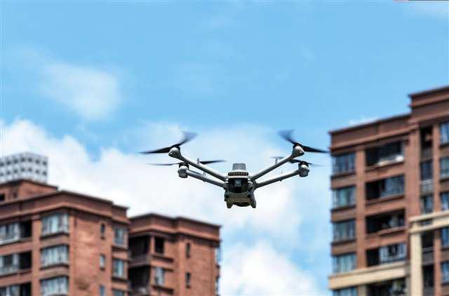 7月23日,北碚區(qū)城區(qū),一架智能無人機在空中巡邏助力智慧城市管理。特約攝影 秦廷富/視覺重慶