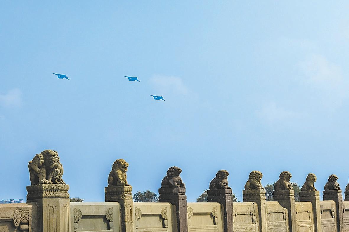 空中編隊(duì)飛越盧溝橋,向抗戰(zhàn)英魂致敬。金春花 攝