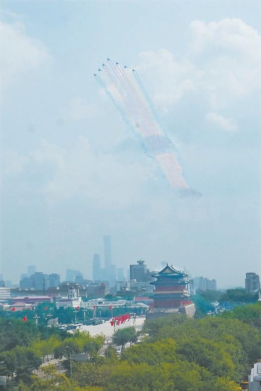 戰(zhàn)機(jī)編隊(duì)拉出的彩煙與中軸線上的古都風(fēng)貌交相輝映。趙瑞 攝