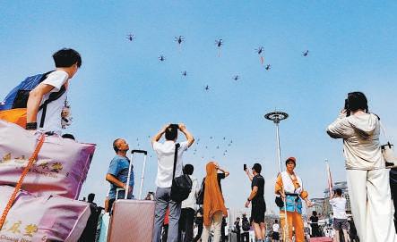 北京站前廣場旅客駐足觀看直升機(jī)梯隊(duì)。記者 安旭東 攝