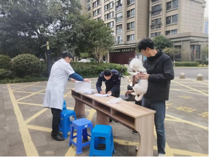 行動(dòng)中,執(zhí)法隊(duì)在各社區(qū)的物業(yè)中心或公共活動(dòng)區(qū)域設(shè)立了“一站式”便民服務(wù)點(diǎn)。執(zhí)法人員、社區(qū)工作者及專業(yè)獸醫(yī)團(tuán)隊(duì)分工協(xié)作,現(xiàn)場秩序維護(hù)、信息核驗(yàn)、犬只免疫、芯片植入等環(huán)節(jié)銜接順暢。獸醫(yī)團(tuán)隊(duì)嚴(yán)格規(guī)范免疫與芯片植入流程,確保操作安全精準(zhǔn);執(zhí)法隊(duì)隊(duì)員現(xiàn)場解讀文明養(yǎng)犬法規(guī),解答居民疑問;社區(qū)工作人員同步完成犬主信息、犬只特征、免疫記錄及芯片編碼的“四維”信息采集,確保登記在冊的信息完整、準(zhǔn)確。
