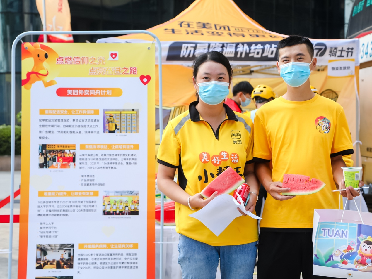 今年7月17日是第五個(gè)“717騎士節(jié)”,為向廣大騎手傳遞節(jié)日關(guān)懷、加強(qiáng)騎手勞動(dòng)安全保障,美團(tuán)配送在全國超過100個(gè)城市增設(shè)防暑驛站,為騎手提供休息場所和消暑補(bǔ)給,并向騎手發(fā)放防曬用品和夏季常用藥品等防暑物資。在深圳、杭州、成都等7個(gè)城市,美團(tuán)配送的騎手健康體檢車也開上街頭,為騎手提供“隨到隨檢”的便捷服務(wù)。