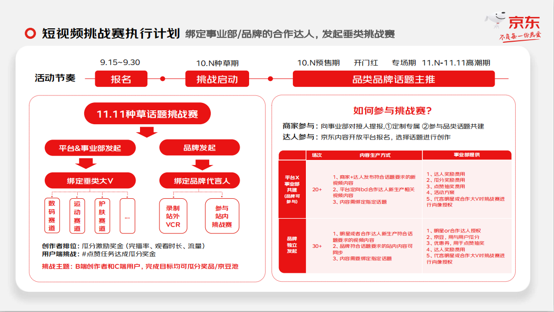 今年京東11.11期間,京東內(nèi)容業(yè)務(wù)將持續(xù)加速深耕短視頻營(yíng)銷(xiāo)陣地,在短視頻呈現(xiàn)、商家端、消費(fèi)端玩法和創(chuàng)作者玩法三個(gè)方面進(jìn)行升級(jí),以“話題挑戰(zhàn)賽”玩法喚醒用戶與品牌間的情感共鳴。
