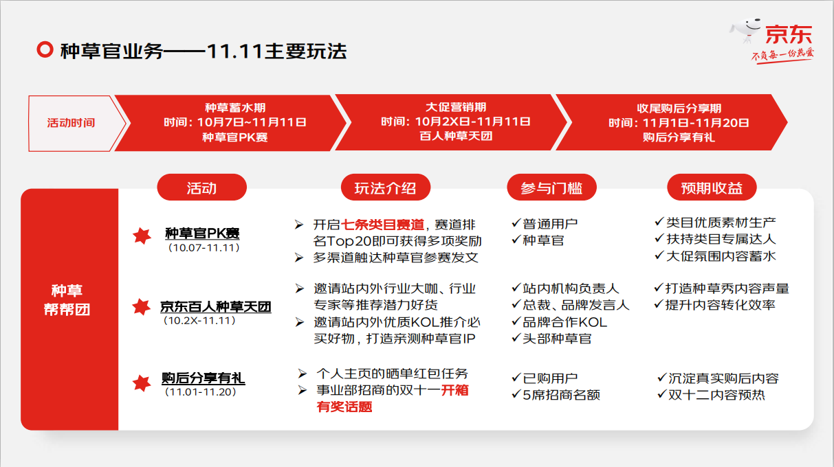 京東11.11期間,“種草官業(yè)務(wù)”將推出“種草PK賽”、“京東百人種草天團(tuán)”、“購(gòu)后分享有禮”三大玩法,開(kāi)啟七條類(lèi)目賽道,邀請(qǐng)站內(nèi)外行業(yè)大咖、優(yōu)質(zhì)KOL推薦好貨,并通過(guò)曬單紅包任務(wù)和參與“11.11開(kāi)箱有獎(jiǎng)話題”激勵(lì)種草官進(jìn)行分享。
