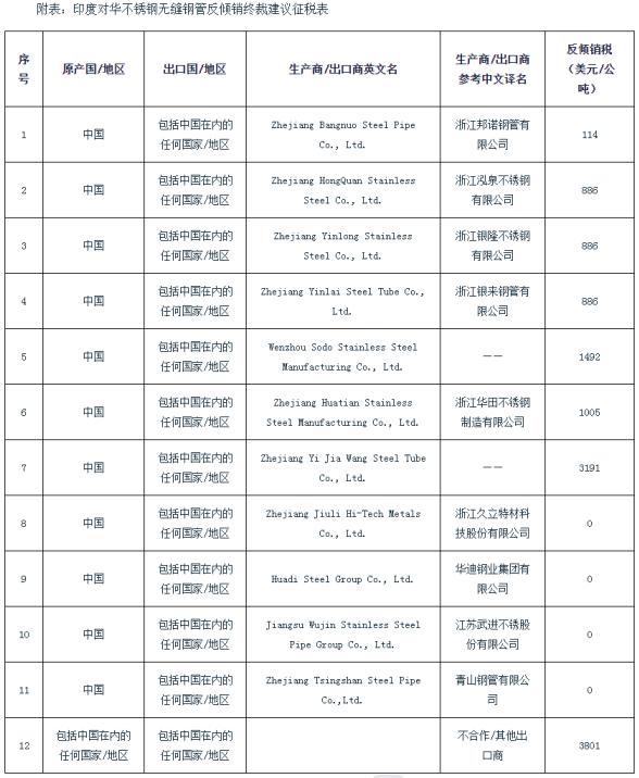 2022年9月23日,印度商工部發(fā)布公告,對(duì)原產(chǎn)于或進(jìn)口自中國(guó)的直徑小于等于6英寸的不銹鋼無(wú)縫鋼管(Stainless-steel Seamless Tubes & Pipes)作出反傾銷終裁,建議對(duì)中國(guó)的涉案產(chǎn)品征收為期5年的反傾銷稅,稅額為0~3801美元/公噸,征稅詳情見(jiàn)附表(印度對(duì)華不銹鋼無(wú)縫鋼管反傾銷終裁建議征稅表)。涉案產(chǎn)品為無(wú)論是采用熱擠壓工藝或熱穿孔工藝制造,無(wú)論是作為熱加工管或冷加工管售賣,包括缺陷品、非打印品或二級(jí)品在內(nèi)的、公稱直徑不超過(guò)6英寸或與其相當(dāng)?shù)钠渌?jì)量單位的不銹鋼無(wú)縫鋼管,涉及印度海關(guān)編碼7304項(xiàng)下的產(chǎn)品。