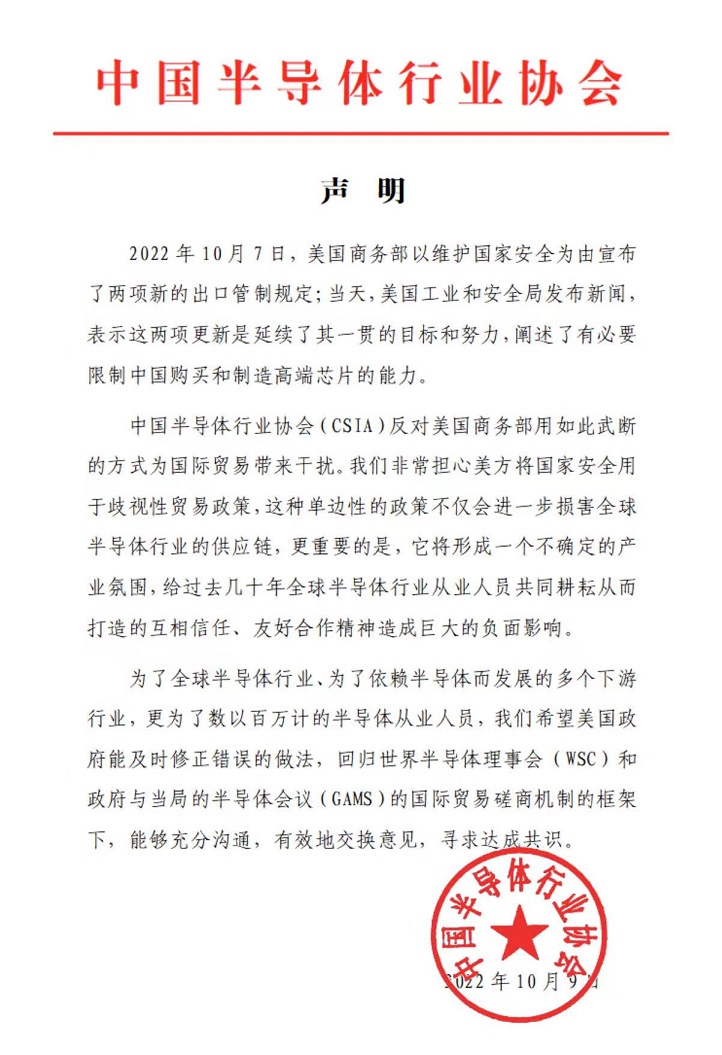 在聲明中,中國(guó)半導(dǎo)體行業(yè)協(xié)會(huì)指出,10月7日,美國(guó)工業(yè)和安全局發(fā)布新聞,表示這兩項(xiàng)出口管制規(guī)定更新是延續(xù)了其一貫的目標(biāo)和努力,闡述了有必要限制中國(guó)購(gòu)買和制造高端芯片的能力。