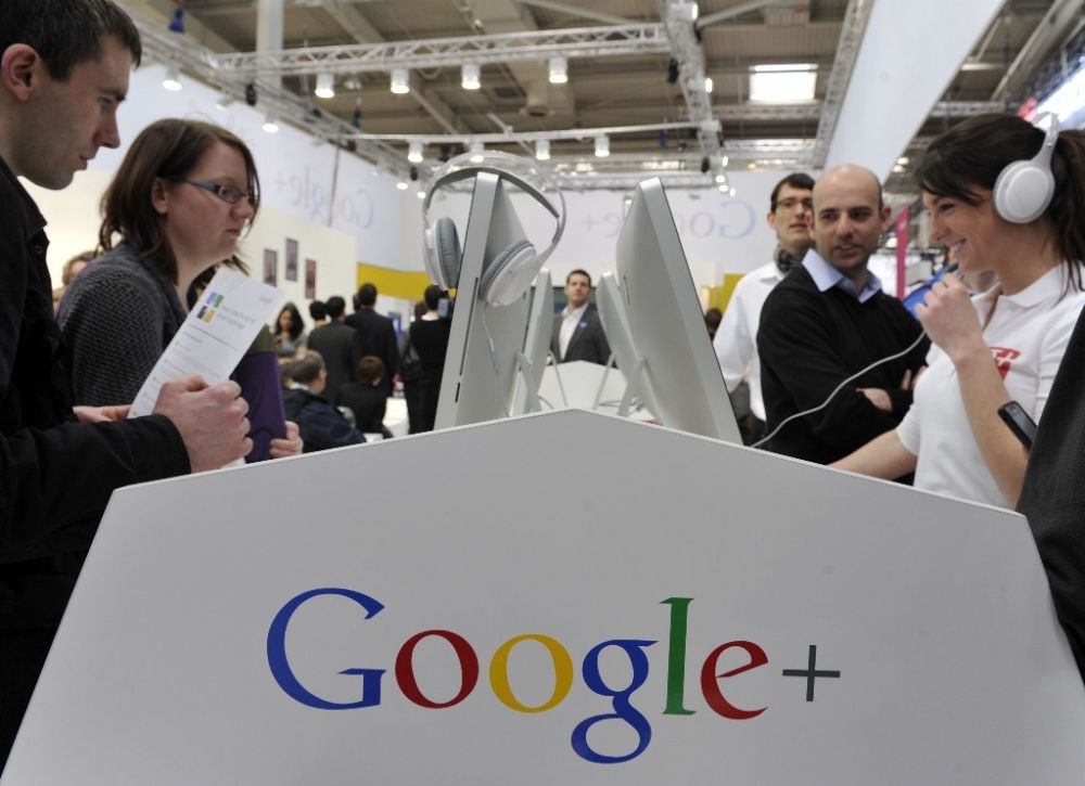 這是2012年3月6日,在德國(guó)漢諾威會(huì)展中心舉行的漢諾威信息及通信技術(shù)博覽會(huì)上,參觀者在谷歌展臺(tái)參觀。新華社記者馬寧攝
