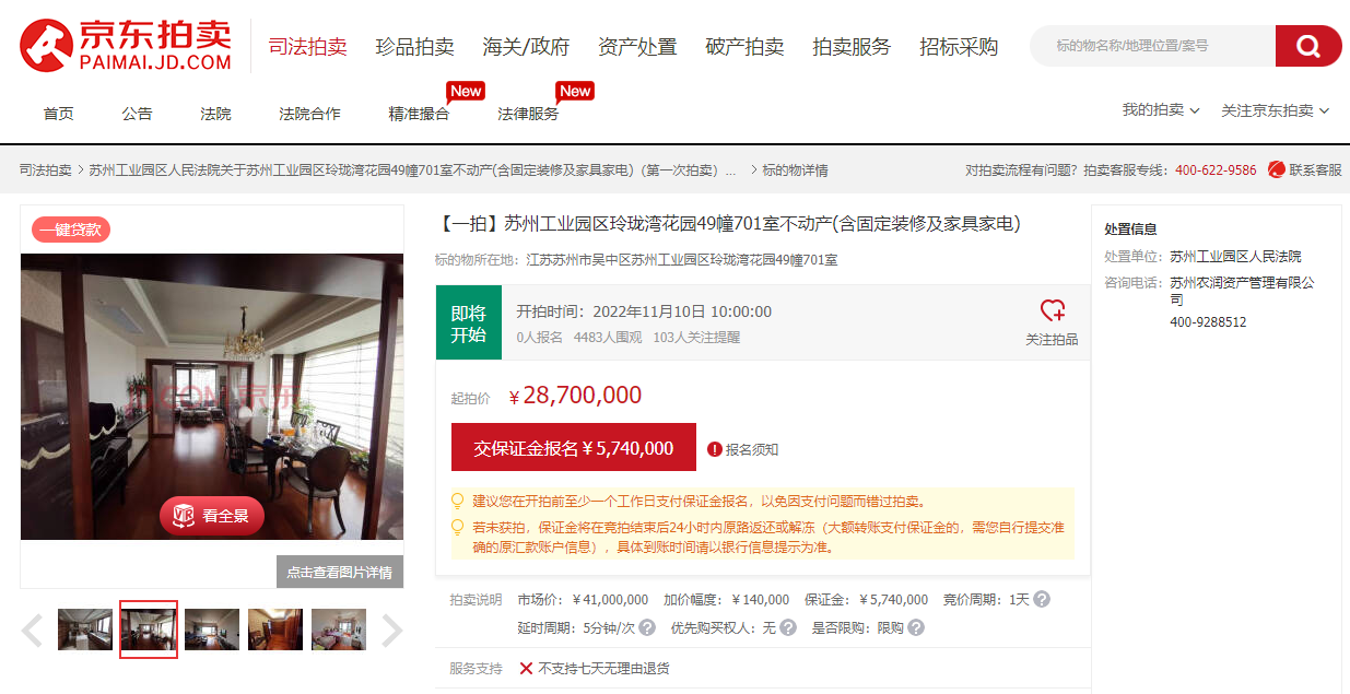 說起玲瓏灣,稍微了解蘇州房市的人都清楚,這里一直是蘇州普通住宅單價(jià)的天花板。該小區(qū)位于蘇州工業(yè)園區(qū),得天獨(dú)厚的地理位置,可以把金雞湖的湖景盡收眼底,經(jīng)常出現(xiàn)在國(guó)內(nèi)影視劇中,可謂是園區(qū)的明星樓盤。本次蘇州法拍節(jié)期間開拍的一套約300平米的大平層,裝修奢華,站在陽(yáng)臺(tái)即可飽覽金雞湖美景,市場(chǎng)評(píng)估價(jià)4100萬(wàn)元,將在11月10日以2870萬(wàn)元進(jìn)行拍賣。