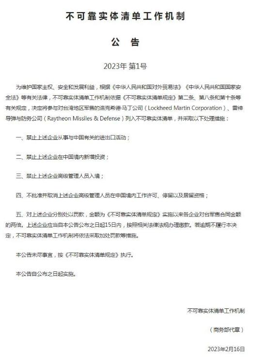 據(jù)商務(wù)部官網(wǎng)消息,2月16日,不可靠實(shí)體清單工作機(jī)制發(fā)布2023年第1號公告,決定將洛克希德·馬丁公司、雷神導(dǎo)彈與防務(wù)公司列入不可靠實(shí)體清單。