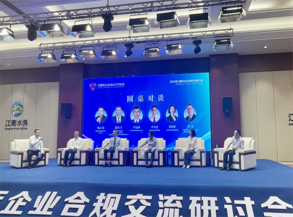 在合規(guī)主題圓桌對(duì)談環(huán)節(jié),賽尼爾法務(wù)智庫總裁葉小忠、北京金杜律所高級(jí)顧問董嬌嬌、江南水務(wù)副總經(jīng)理陸慶喜、江蘇泰和律所管委會(huì)主任李遠(yuǎn)揚(yáng)、江陰市企業(yè)法治工作協(xié)會(huì)會(huì)長蔡磊五位嘉賓,分別立足各自領(lǐng)域,圍繞會(huì)議主題深入探討,交流思想、分享經(jīng)驗(yàn)。