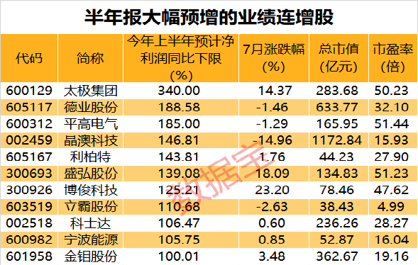 行情上來看,業(yè)績(jī)預(yù)計(jì)連增股本月以下跌為主,平均下跌1.23%,萬澤股份、晶澳科技、康緣藥業(yè)、太極集團(tuán)7月以來跌幅均超過14%。