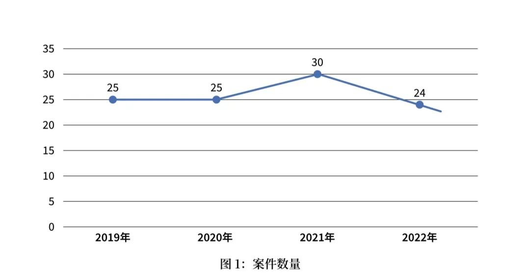 我院于2019年1月1日至2022年12月31日審結(jié)的涉股東出資責(zé)任案件,去除管轄、財(cái)保、指令審理,有效案件共計(jì)104件,包括一審案件3件,二審案件100件,再審案件1件。從結(jié)案年份來(lái)看,2019年為25件,2020年為25件,2021年為30件,2022年為24件。2019年至2021年逐年增加,2021年出現(xiàn)峰值,受新冠疫情等因素影響,2022年結(jié)案數(shù)量有所回落。從以上數(shù)字可見(jiàn),我院審結(jié)的涉股東出資責(zé)任案件數(shù)量總體呈平穩(wěn)上升趨勢(shì)。(如圖1)