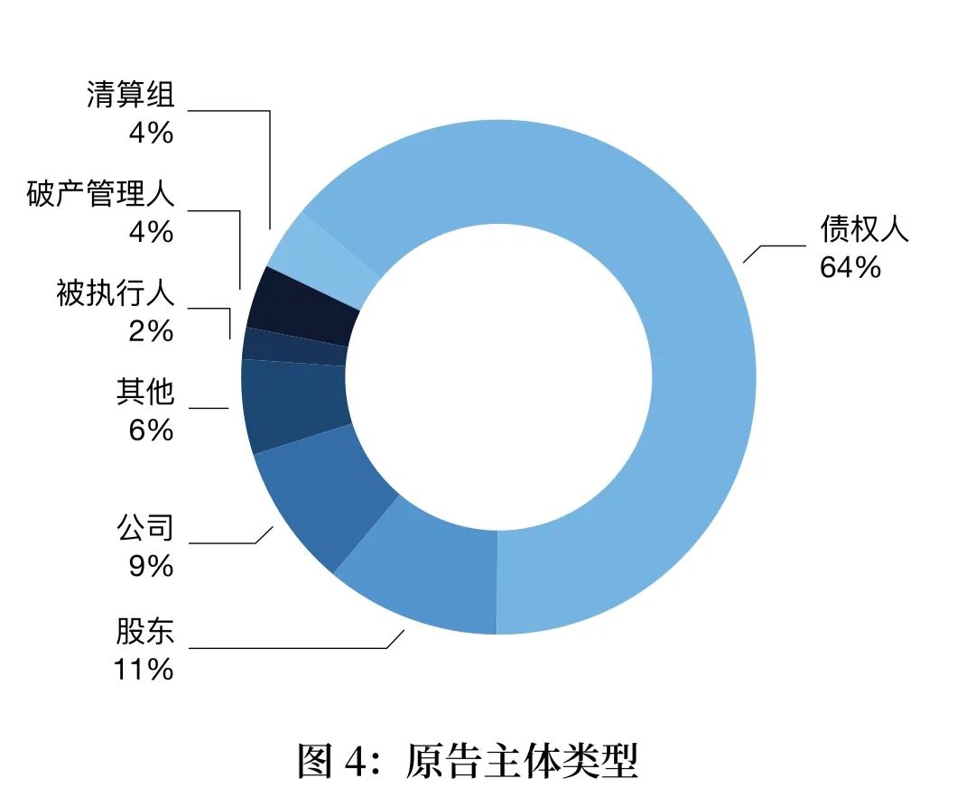 我院近四年審理的涉股東出資責(zé)任案件中,原告的主體范圍包括公司、股東、債權(quán)人、清算組、破產(chǎn)管理人、被執(zhí)行人等,其中債權(quán)人作為原告的案件數(shù)量占比64%,是要求股東承擔(dān)出資責(zé)任的主要群體,占據(jù)絕對(duì)多數(shù)。被告的主體范圍包括公司、違反出資義務(wù)的股東、受讓股東、出資未屆期的股東、協(xié)助抽逃出資董事、高級(jí)管理人員、瑕疵股權(quán)的受讓人等,其中違反出資義務(wù)的股東與出資未屆期的股東作為被告的案件數(shù)量占比56%,也超過(guò)了半數(shù)。綜合原被告的主體范圍數(shù)據(jù),可以發(fā)現(xiàn)我院近四年審理的涉股東出資責(zé)任案件中,大部分系債權(quán)人要求違反出資義務(wù)的股東與出資未屆期的股東承擔(dān)出資責(zé)任的案件。(如圖4、圖5)