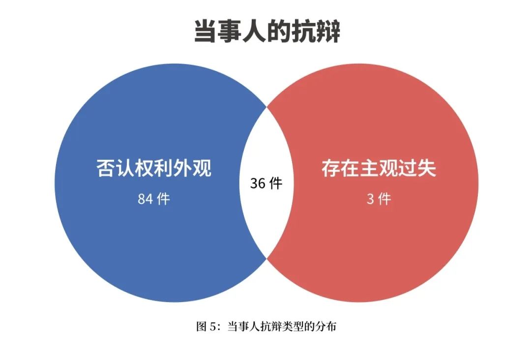 123件涉表見代理商事合同糾紛案件中,有84件抗辯否認(rèn)權(quán)利外觀存在,有3件抗辯相對(duì)人主觀上存在過失,有36件抗辯既否認(rèn)權(quán)利外觀存在,又認(rèn)為相對(duì)人主觀上存在過失。(如圖5)