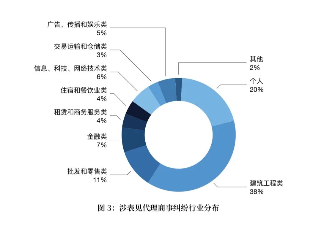 123件涉表見代理商事糾紛案件中,涉訴主體共有327名,其中公司為260家,占79.51%,個(gè)人為67人,占20.49%。在260家公司中,根據(jù)行業(yè)分類,建筑工程類有125家,批發(fā)和零售類有36家,金融類有22家,信息、科技、網(wǎng)絡(luò)技術(shù)類有19家,住宿和餐飲業(yè)有22家,信息傳輸、信息技術(shù)服務(wù)業(yè)有18家,租賃和商務(wù)服務(wù)有14家,建筑業(yè)有12家,交通運(yùn)輸、倉(cāng)儲(chǔ)業(yè)有9家,娛樂業(yè)有6家,其他行業(yè)有6家。(如圖3)
