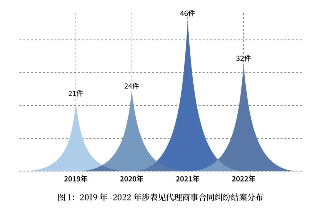 2019年至2022年,我院共審結(jié)涉表見代理商事合同案件共計(jì)123件,均為二審案件。從結(jié)案時(shí)間來看,2019年審結(jié)21件,2020年審結(jié)24件,2021年審結(jié)46件,2022年審結(jié)32件。涉表見代理商事合同糾紛案件案件數(shù)在2021年達(dá)到峰值,是2020年案件數(shù)的近2倍,同時(shí)也比2022年案件數(shù)多出43.75%,結(jié)案數(shù)整體呈兩頭小、中間大的正態(tài)分布趨勢(shì)。(如圖1)