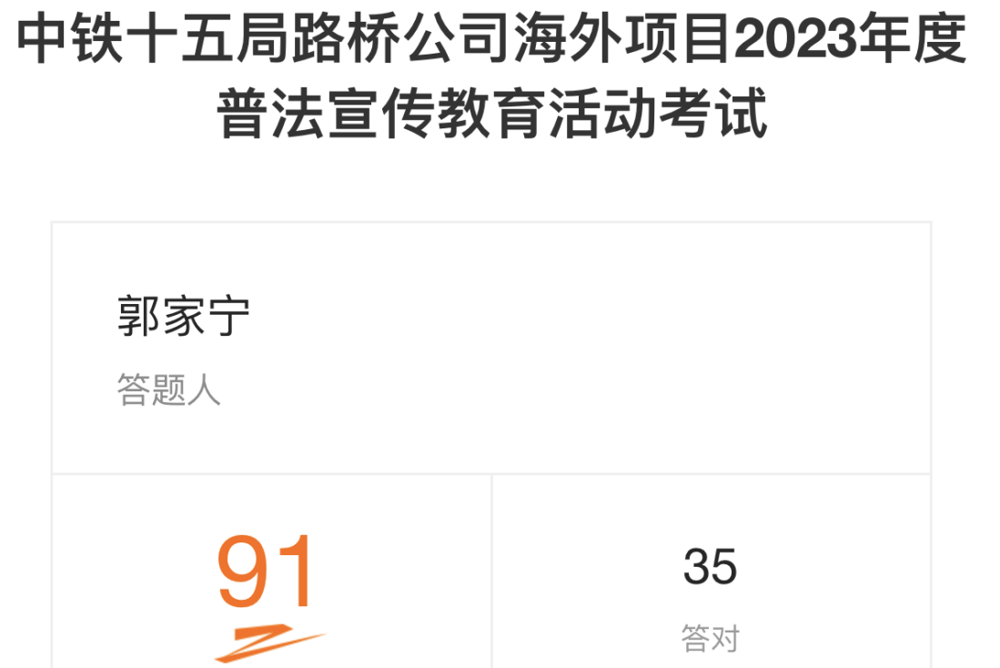 活動(dòng)期間,公司境外項(xiàng)目開展線上法律知識(shí)測試活動(dòng),試卷內(nèi)容涉及憲法、民法 、安全生產(chǎn)法等法律法規(guī)知識(shí),深入貼合職工生活和工作實(shí)際,針對(duì)性強(qiáng)。通過以考促學(xué)、以考促用,為建設(shè)法治路橋、平安路橋提供堅(jiān)強(qiáng)有力保障。