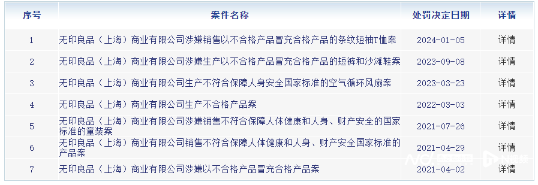 此外,南都·灣財社記者發(fā)現(xiàn),此次也并非無印良品(上海)商業(yè)有限公司首次因為產(chǎn)品質(zhì)量問題被罰。上海市市場監(jiān)督管理局顯示,2021年4月2日至2024年1月5日期間,無印良品(上海)商業(yè)有限公司共有7次因生產(chǎn)、銷售不合格產(chǎn)品,被多次處罰的案例。