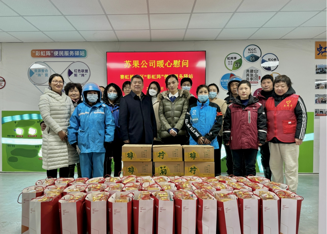 1月18日上午,寒風(fēng)凜冽,蘇果愛心志愿者團(tuán)隊(duì)來到南京市雨花臺(tái)區(qū)賽虹橋社區(qū)“彩虹陣”便民服務(wù)驛站,為社區(qū)內(nèi)的外賣員、快遞員、環(huán)衛(wèi)工人等冬季戶外工作者送來保溫桶、姜糖茶、面包、麥片、飲料等關(guān)愛物資,向他們表示關(guān)懷與敬意。“很感動(dòng),也很感謝來自蘇果的關(guān)愛,天氣雖冷,但是我們的心確是暖暖的?!碧K果的善意之舉,令戶外工作者們感受到濃濃的暖意。