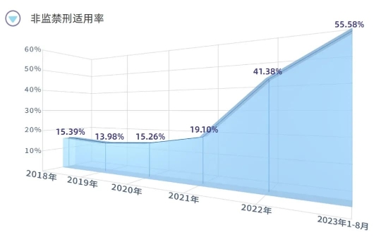 從非監(jiān)禁刑的適用情況看,輕罪案件被宣告緩刑、判處管制、單處罰金等非監(jiān)禁刑的比例呈現上升趨勢,近兩年來尤為明顯。2018年非監(jiān)禁刑適用率僅為15.39%,2022年該比例則上升至41.38%,較2018年上升26個百分點。今年1-8月份,非監(jiān)禁刑的適用率則上升至55.58%。