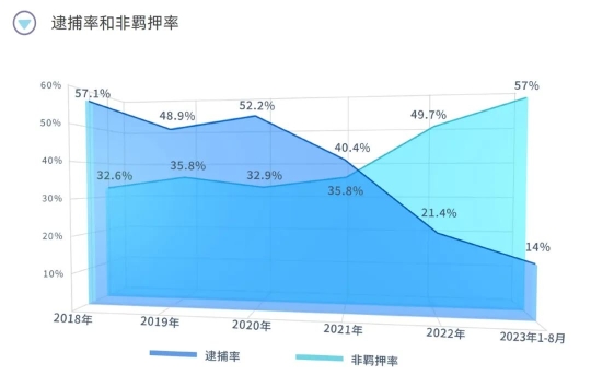 拘留和逮捕等羈押性強制措施是為了保障刑事訴訟順利進行,適用于嚴重犯罪或者有社會危險性,有再犯、串供等風險的案件。輕罪案件因行為本身情節(jié)較輕,社會危害性相對較小,一些抽象危險犯,如危險駕駛罪等,甚至沒有造成實害后果。另外,隨著偵查水平和科技程度的與日俱增,刑事案件的定案對口供的依賴程度明顯降低,尤其法定犯的犯罪性質決定了證據上以客觀證據為主,辦案過程中對羈押的需求減弱。因此,針對輕罪案件采取羈押措施更為審慎,逮捕強制措施的適用比例不斷降低,取保候審等非羈押強制措施的適用比例大幅上升。2018年海淀區(qū)檢察院受理的輕罪案件中,采取逮捕強制措施的為57.1%,采取取保候審、監(jiān)視居住等非羈押強制措施的為32.6%;2019年,二者占比分別為48.9%、35.8%;2022年,二者比例則為21.4%、49.7%;2023年1-8月,采取逮捕強制措施的比例下降至14%,非羈押強制措施的適用率則上升至57%。