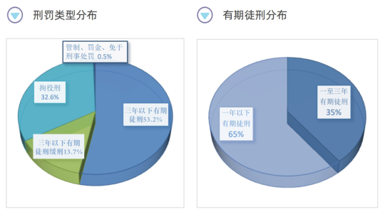從輕罪案件的刑罰情況看,經審判被判處三年以下有期徒刑實刑的6189人,占比53.2%;判處三年以下有期徒刑緩刑的1598人,占比13.7%;判處拘役刑的3796人,占比32.6%;判處管制、單處罰金和免予刑事處罰的60人,占比0.5%。此外,經審判判處三年以下有期徒刑的人中,刑期在一年以下的5065人,占比達65%。