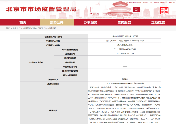 此前,據(jù)新京報(bào)等媒體報(bào)道,CK運(yùn)營主體鵬衛(wèi)齊商業(yè)(上海)有限公司多次因以次充好被罰。