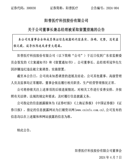 4月7日晚間,陽普醫(yī)療(300030.SZ,股價5.5元,市值17.01億元)公告,于近日收到廣東省監(jiān)察委員會簽發(fā)的《立案通知書》和《留置通知書》,公司董事長、總經(jīng)理鄧冠華因涉嫌違紀(jì)違法被立案調(diào)查、實施留置。截至公告日,公司尚未知悉調(diào)查的進(jìn)展及結(jié)論。公司其他董事、高級管理人員及監(jiān)事均正常履職,董事會依法履行相關(guān)職責(zé),生產(chǎn)經(jīng)營管理情況正常。