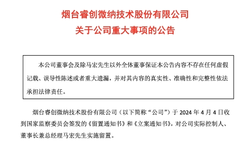 4月7日晚間,睿創(chuàng)微納(688002.SH,股價36.94元,市值165.23億元)發(fā)布公告稱,公司于4月4日收到國家監(jiān)察委員會簽發(fā)的《留置通知書》和《立案通知書》,對公司實際控制人、董事長兼總經(jīng)理馬宏實施留置。