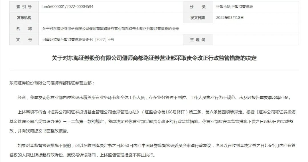 據(jù)公開信息顯示,2022年3月18日,河南監(jiān)管局官網(wǎng)披露,東海證券偃師商都路證券營業(yè)部內(nèi)控管理未覆蓋所有業(yè)務(wù)環(huán)節(jié)和全體工作人員,存在業(yè)務(wù)管控不到位、工作人員執(zhí)業(yè)行為不規(guī)范、未及時(shí)報(bào)告重要事項(xiàng)等問題。河南監(jiān)管局決定對該公司偃師商都路證券營業(yè)部采取責(zé)令改正的行政監(jiān)管措施,并對業(yè)部負(fù)責(zé)人高培芳、合規(guī)管理人員王洪波以及員工陳佳佳出具警示函。