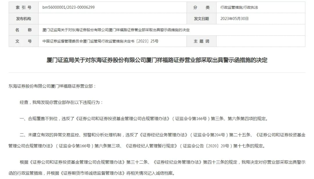 2023年5月30日,廈門證監(jiān)局網(wǎng)站也披露了一則開給東海證券廈門祥福路證券營業(yè)部的行政監(jiān)管措施決定書。經(jīng)查,該營業(yè)部存在合規(guī)覆蓋不到位,未建立有效的異常交易監(jiān)控、預(yù)警和分析處理機(jī)制等違規(guī)行為。廈門證監(jiān)局決定對其采取出具警示函的行政監(jiān)管措施,并根據(jù)《證券期貨市場誠信監(jiān)督管理辦法》將相關(guān)情況記入誠信檔案。此外,2023年2月,東海證券因其在金洲慈航集團(tuán)股份有限公司2015年重大資產(chǎn)重組中,開展獨(dú)立財(cái)務(wù)顧問業(yè)務(wù)涉嫌未勤勉盡責(zé),被證監(jiān)會立案調(diào)查。截至目前,該案件仍處于立案調(diào)查階段。