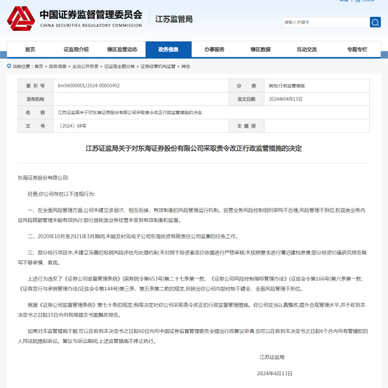 根據(jù)《證券公司監(jiān)督管理?xiàng)l例》第七十條的規(guī)定,江蘇證監(jiān)局決定對東海證券采取責(zé)令改正的行政監(jiān)督管理措施。同時(shí),該局要求東海證券應(yīng)當(dāng)認(rèn)真整改,提升合規(guī)管理水平,并于收到?jīng)Q定書之日起15日內(nèi)向江蘇證監(jiān)局提交書面整改報(bào)告。