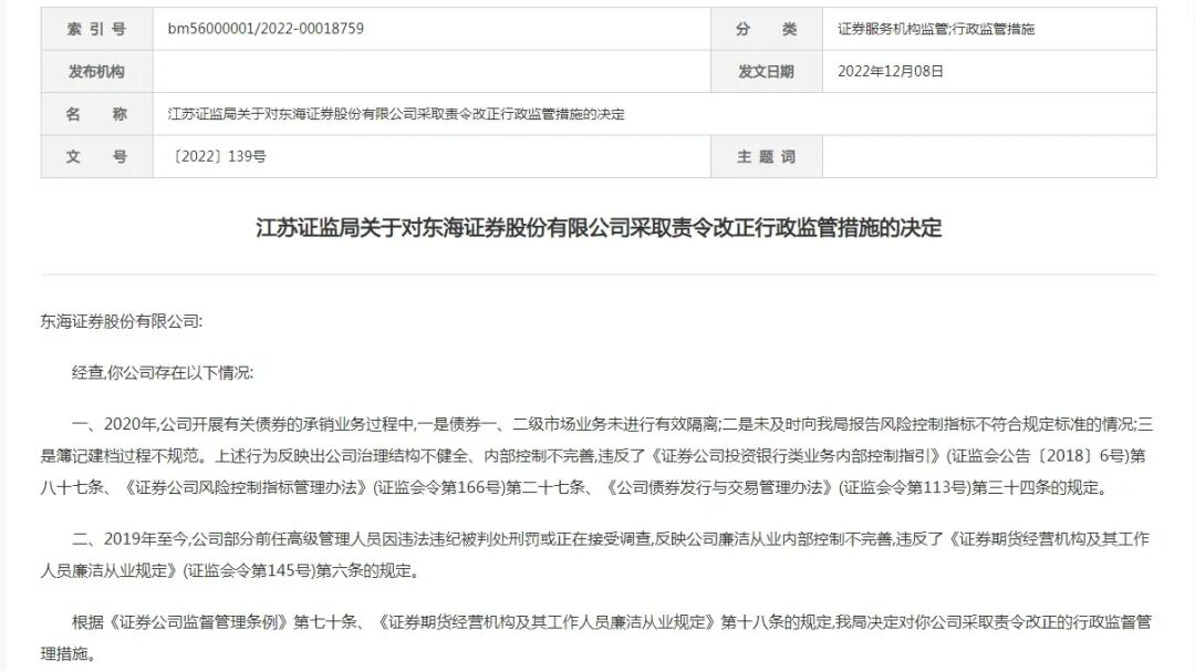 同年12月16日,江蘇證監(jiān)局官網(wǎng)披露,2020年,東海證券在開展有關(guān)債券承銷業(yè)務(wù)過程中存在治理結(jié)構(gòu)不健全、內(nèi)部控制不完善等問題;2019年至今,該公司部分前任高級管理人員因違法違紀(jì)被判處刑罰或正在接受調(diào)查,反映該公司廉潔從業(yè)內(nèi)部控制不完善。江蘇證監(jiān)局對該公司采取責(zé)令改正的行政監(jiān)督管理措施,其時(shí)任總裁殷建華、時(shí)任債券發(fā)行部負(fù)責(zé)人許曉明均被警示。