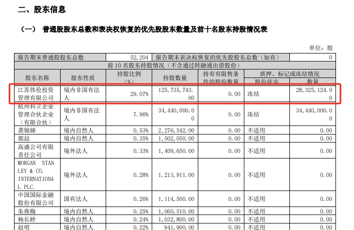 根據(jù)宏達新材2024年第一季度報告,江蘇偉倫持有12573.57萬股宏達新材股票,持股比例29.07%,其中2832.51萬股處于被凍結(jié)狀態(tài)。另據(jù)天眼查顯示,江蘇偉倫成立于2007年,注冊資本8696萬元,公司實際控制人為朱恩偉,法定代表人為吳寶歧。