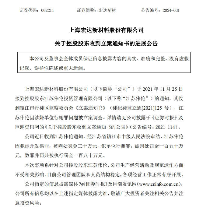 據(jù)公告披露,宏達新材于2021年11月25日接到控股股東江蘇偉倫的通知,其收到鎮(zhèn)江市丹徒區(qū)監(jiān)察委員會《立案通知書》(徒紀徒監(jiān)立通[2021]125號),江蘇偉倫因涉嫌單位行賄罪問題被立案調(diào)查。